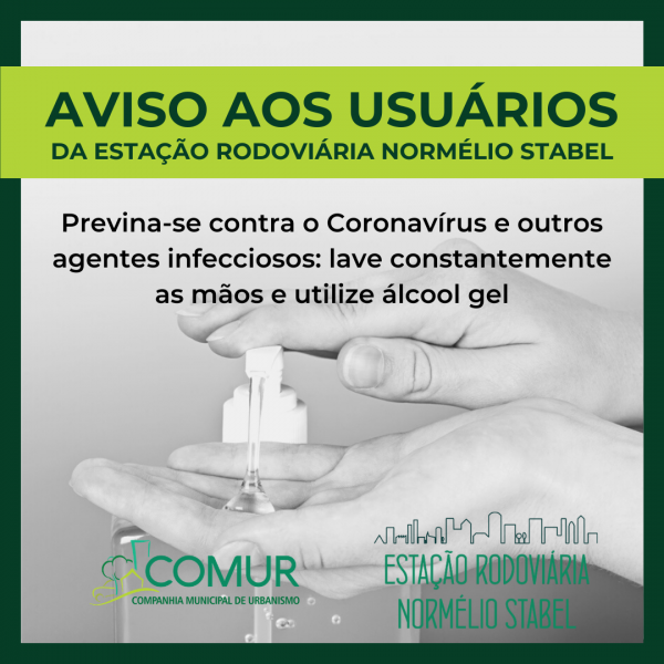 A Estação Rodoviária Normélio Stabel, por se tratar de um local com grande circulação de pessoas, está oferecendo como medida de prevenção ao Coronavírus e outros agentes infecciosos, a disponibilização de álcool gel. As últimas notícias relacionadas ao Coronavírus, fazem lembrar que o cuidado deve ser constante.