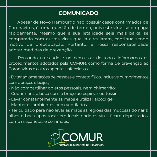 Apesar de Novo Hamburgo não possuir casos confirmados de Coronavírus, é uma questão de tempo, pois este vírus se propaga rapidamente. Mesmo que a sua letalidade seja mais baixa, se comparado com outros vírus que já circularam, continua sendo motivo de preocupação. Portanto, é nossa responsabilidade adotar medidas de prevenção.