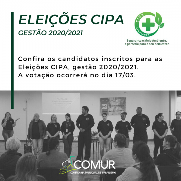 As Eleições CIPA, gestão 2020/2021, estão se aproximando. No dia 17/03, terça-feira, das 08h30 até as 16h, ocorre a votação para eleição dos representantes dos colaboradores.