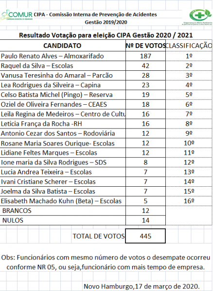 RESULTADO DAS ELEIÇÕES CIPA GESTÃO 2020/2021