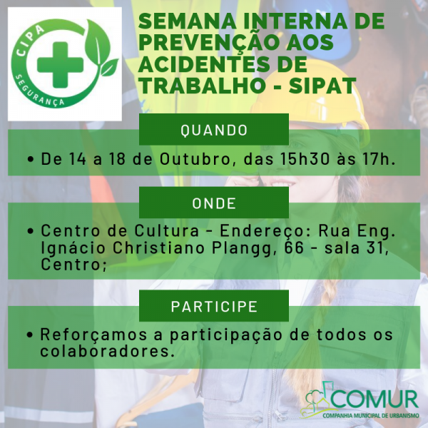 A Companhia Municipal de Urbanismo – COMUR, através da Comissão Interna de Prevenção de Acidentes (CIPA), realizará a 7ª Semana Interna de Prevenção aos Acidentes de Trabalho (SIPAT), entre os dias 14 e 18 de outubro, no Centro Municipal de Cultura (Rua Engenheiro Ignácio Christiano Plangg, 66 - Sala 31, Centro). A programação é direcionada aos colaboradores da COMUR e ocorrerá das 15h30 às 17h.