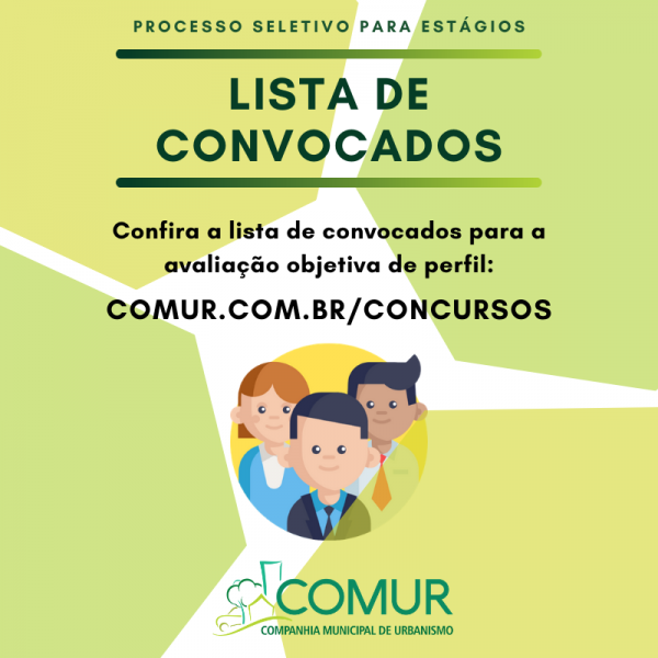 A lista de convocados para a avaliação objetiva de perfil do processo seletivo para estágios da COMUR está disponível para consulta aqui no site, na aba "Concursos" (https://www.comur.com.br/concursos).